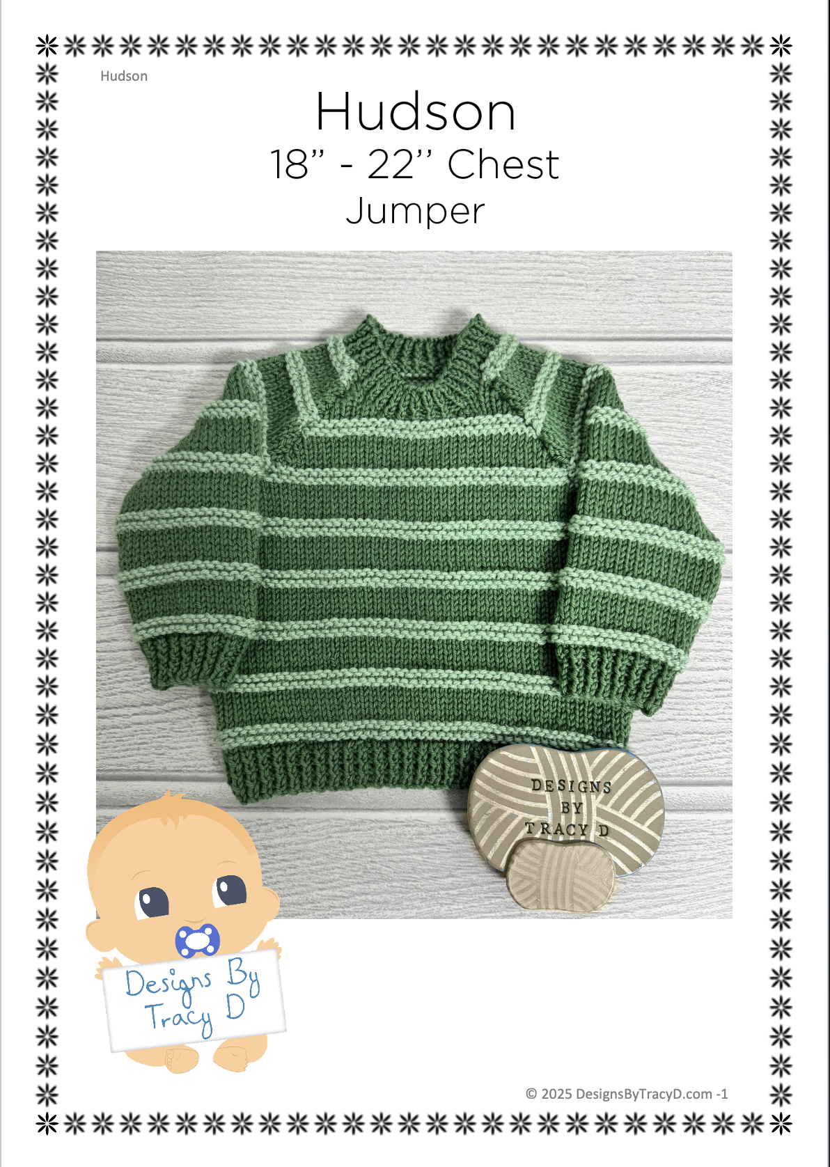 Hudson is a unisex Baby Knitting Pattern for a simple raglan sleeve sweater/jumper in 3 Sizes 18-22" chest. The 18''& 20" chest sizes are made using DK yarn with 3.25mm and 4mm needles and the 22" size is made following the 20" chest size pattern but using 3.75mm and 4.5mm needles with DK yarn. You will need 100:120:120g of DK yarn