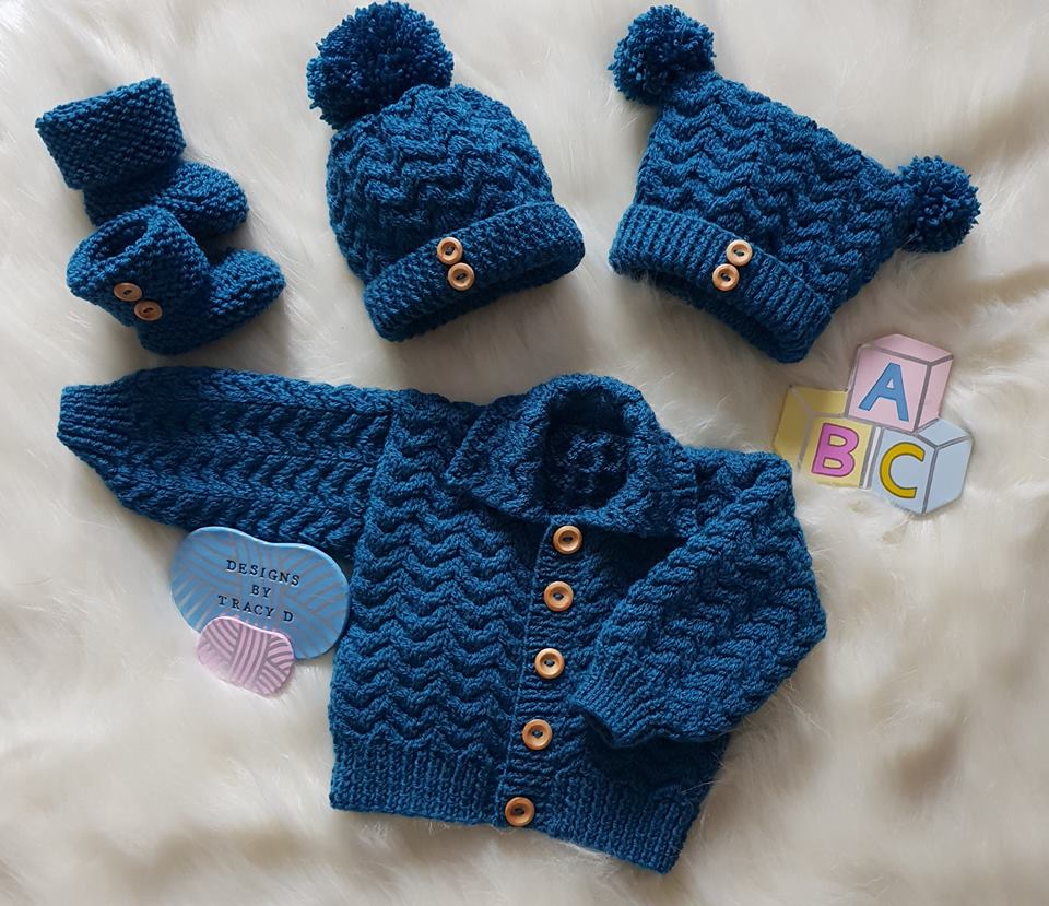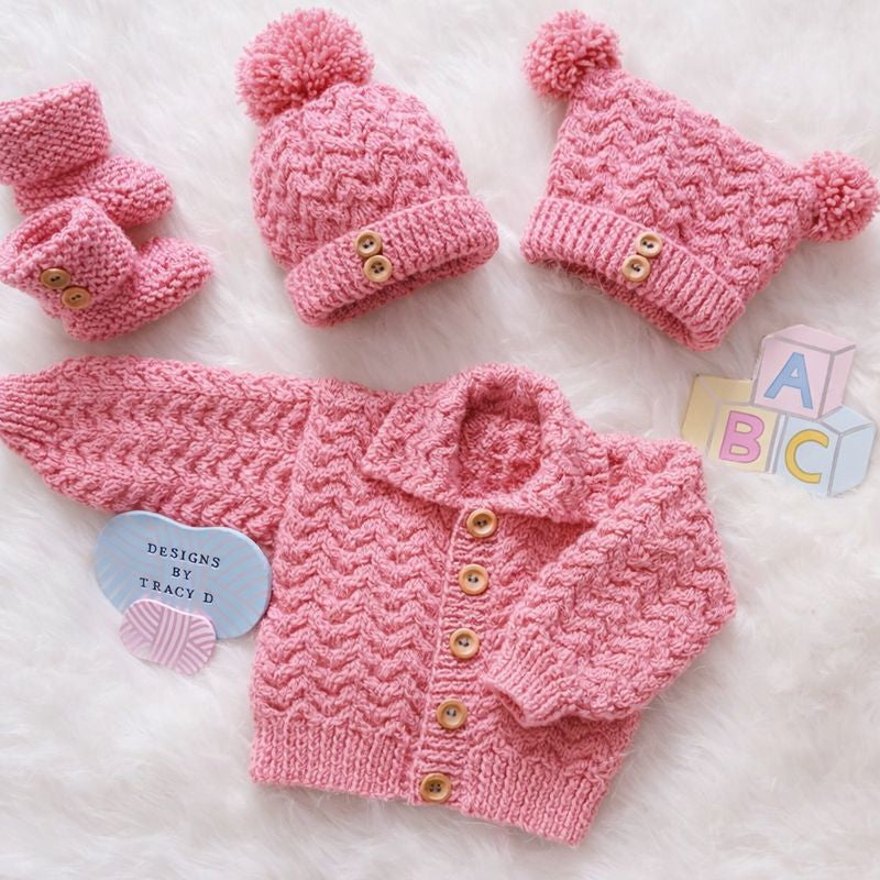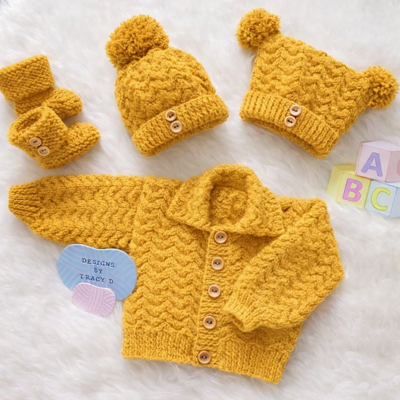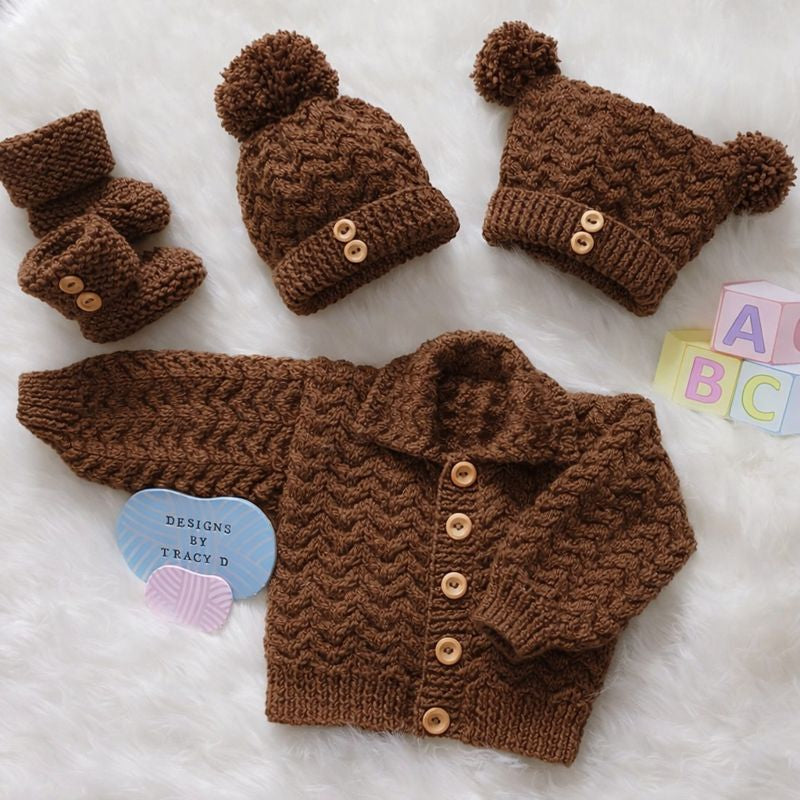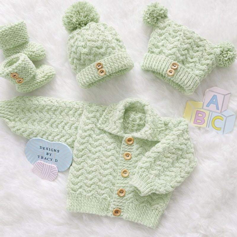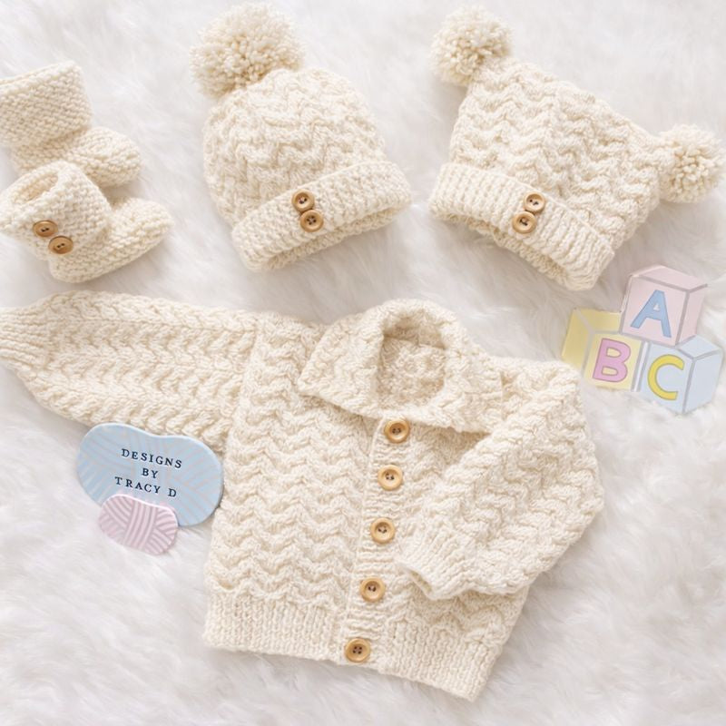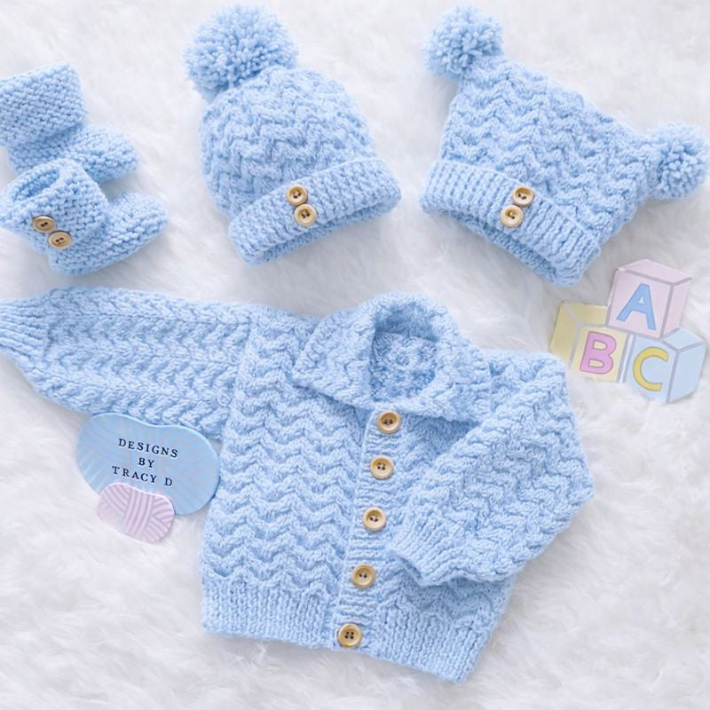 is a unisex Baby Knitting Pattern with a cardigan, 2 styles of hats, and booties to fit a baby with a 16/18" chest size when using DK yarn with 3.25mm and 4mm needles.