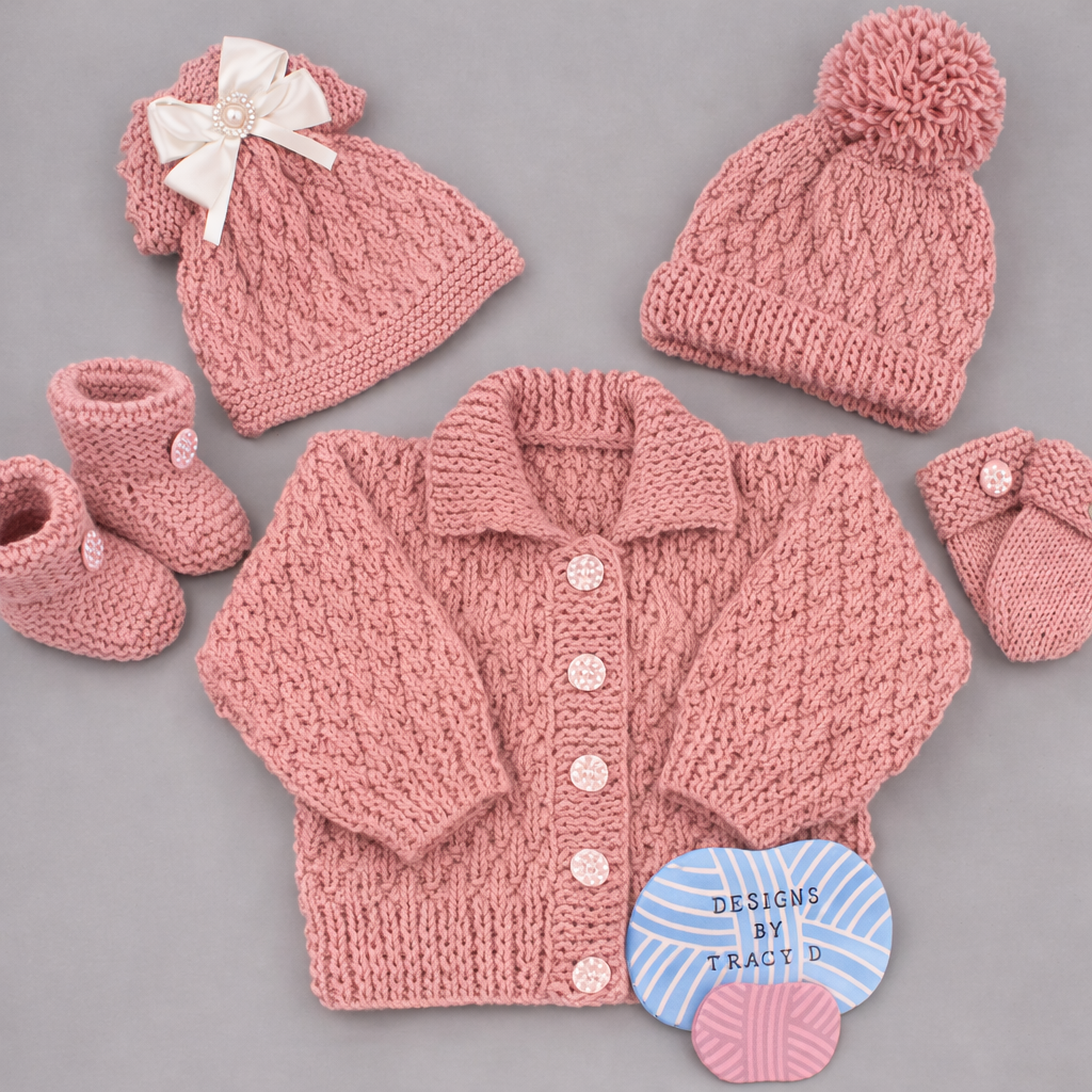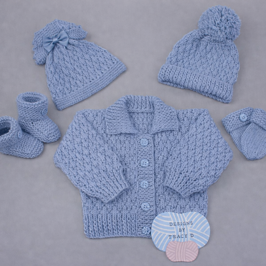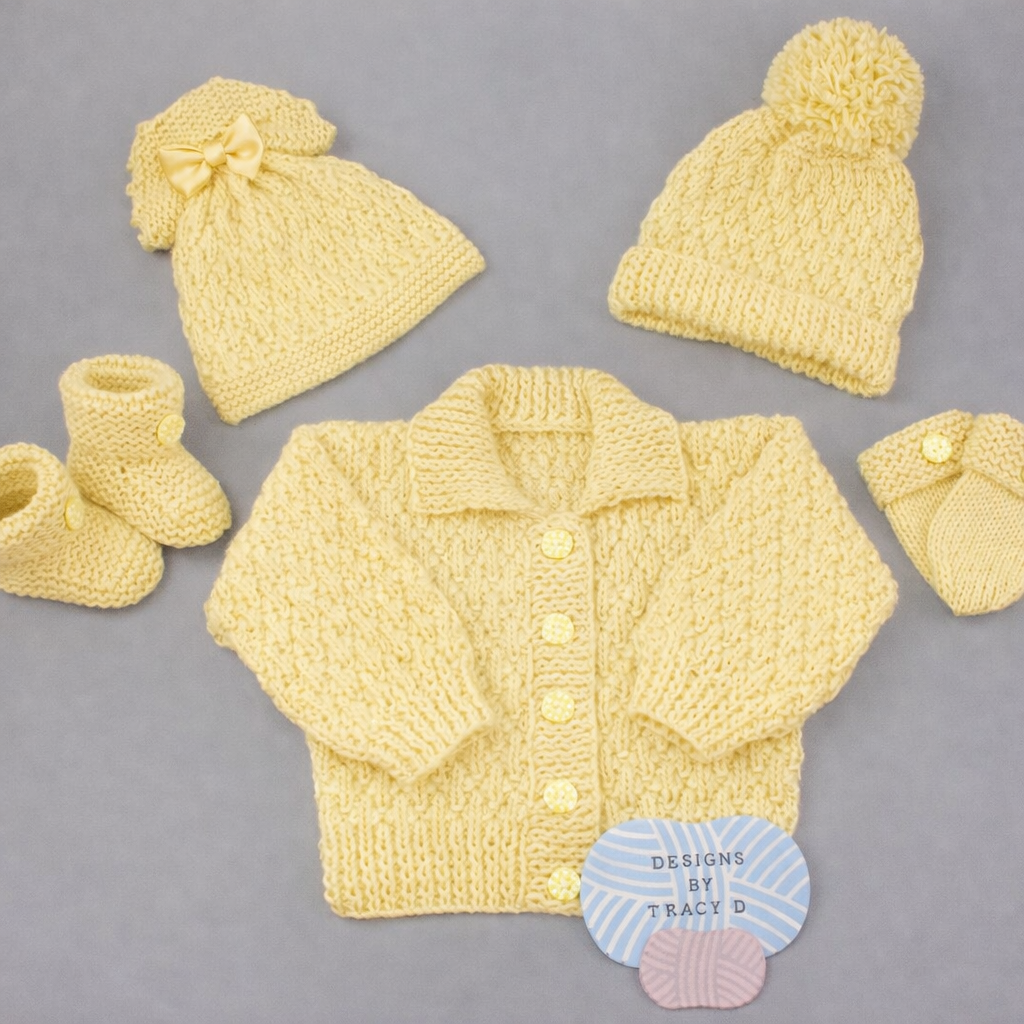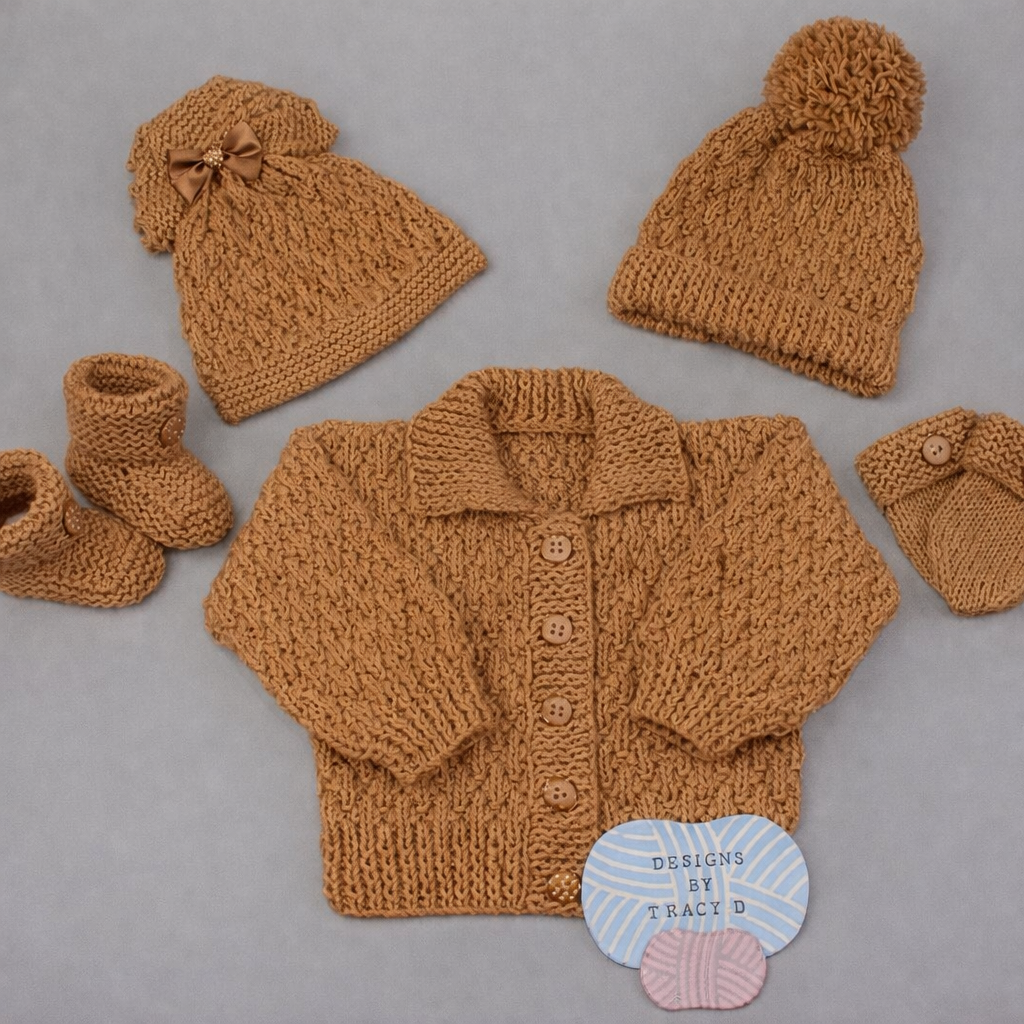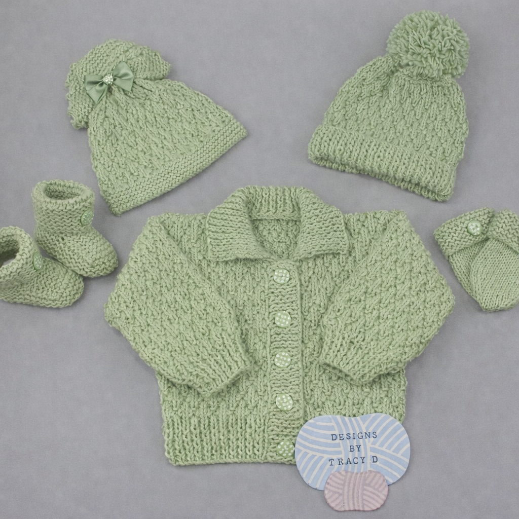 is a unisex Baby Knitting Pattern for a cardigan, 2 styles of hat, mitts, and booties