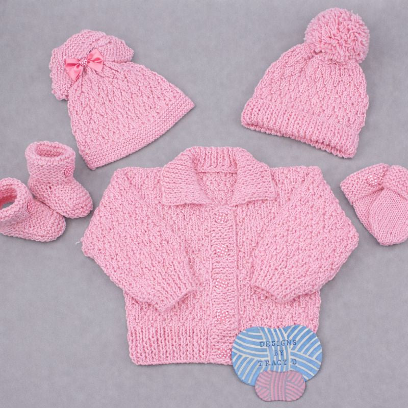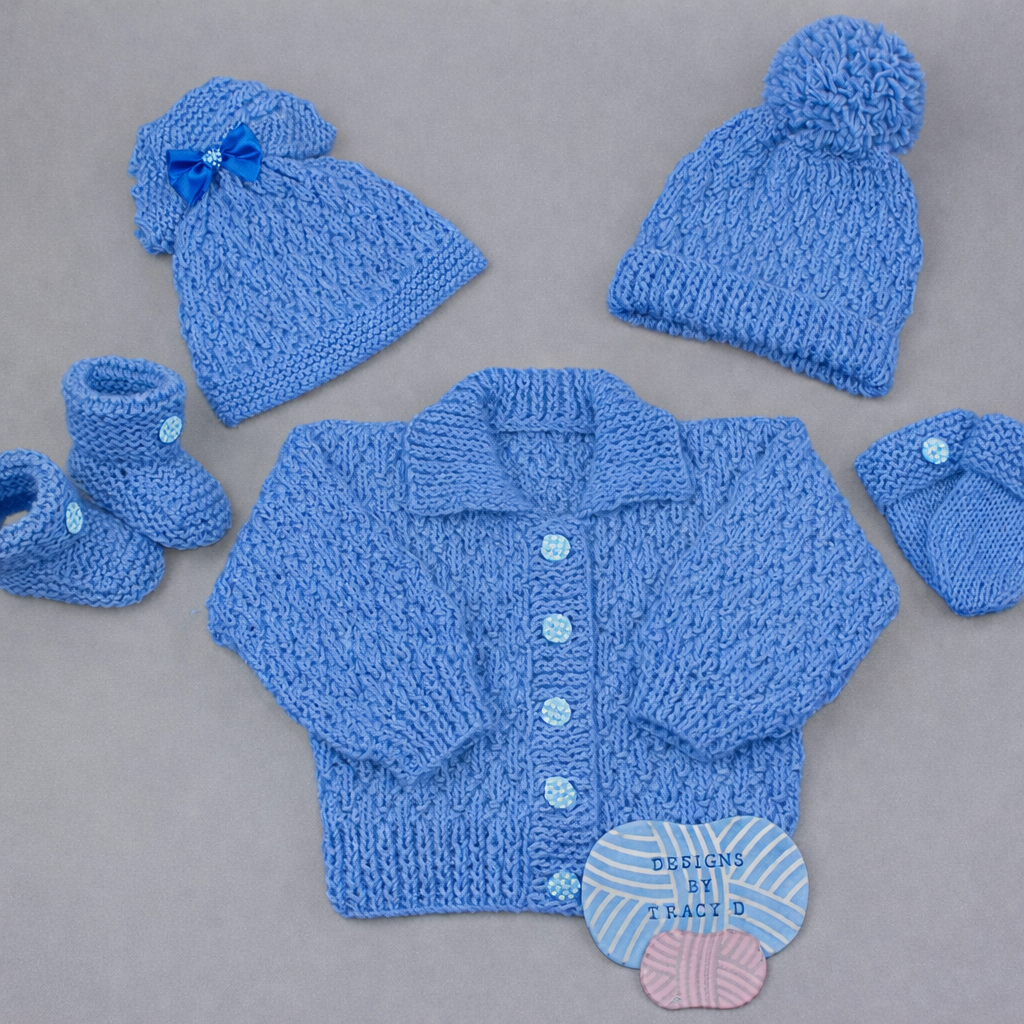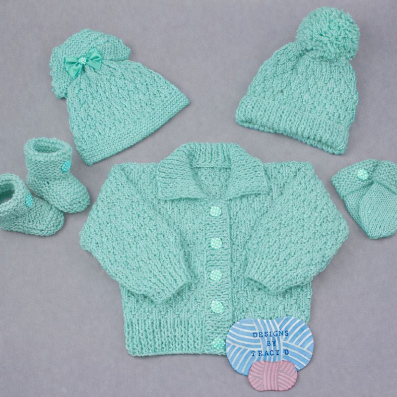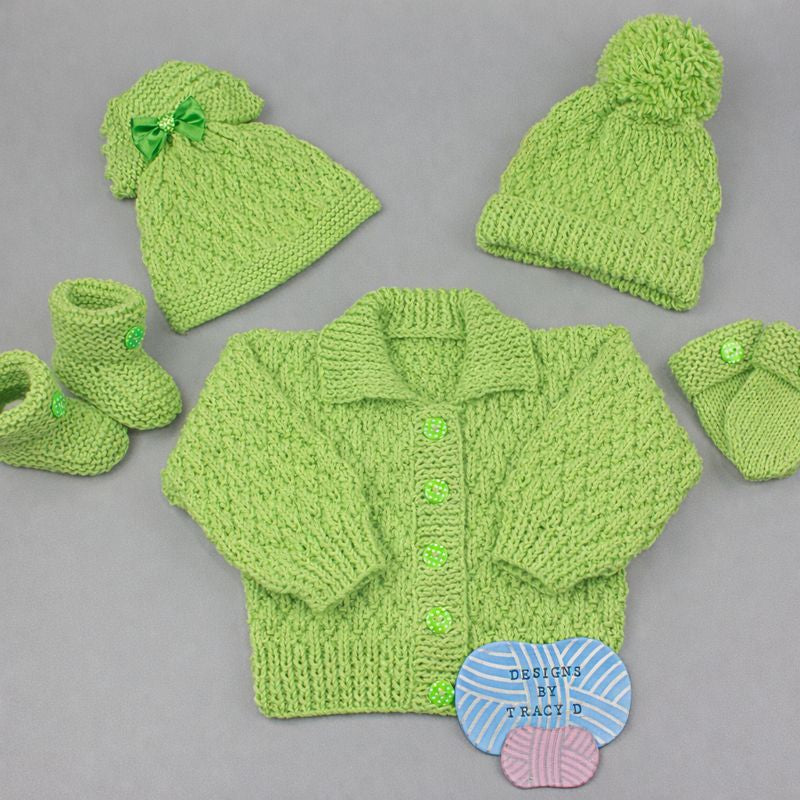 is a unisex Baby Knitting Pattern for a cardigan, 2 styles of hat, mitts, and booties
