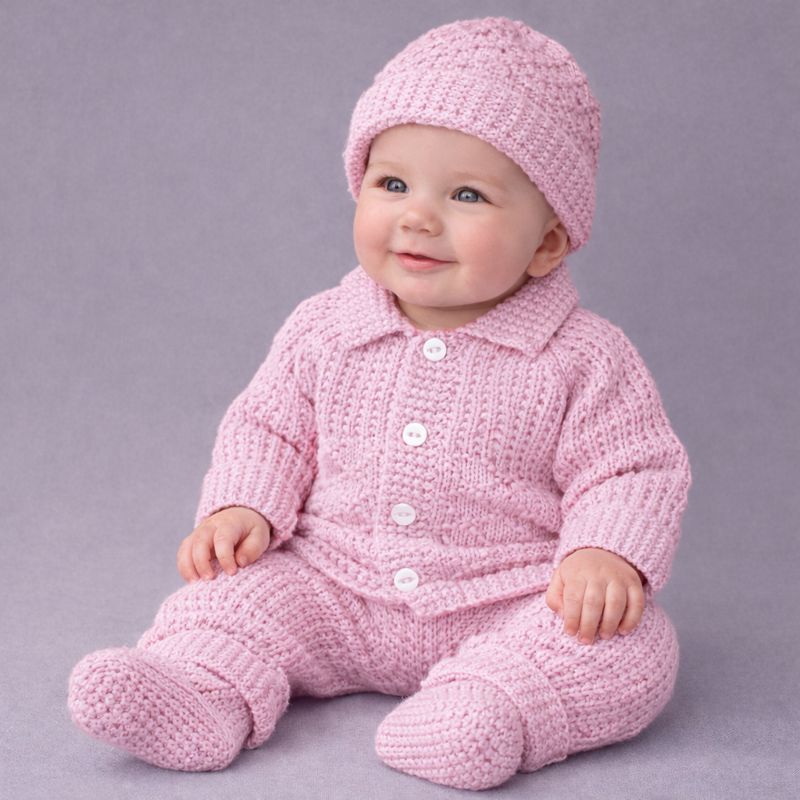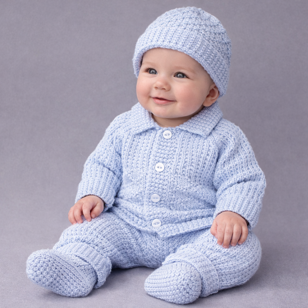 is a Unisex Baby Knitting Pattern for a cardigan, hat, trousers and booties to fit a baby 18" - 20" chest size using DK yarn with 3.25mm & 4mm needles. You will need Approx 350g of DK yarn for the complete set.