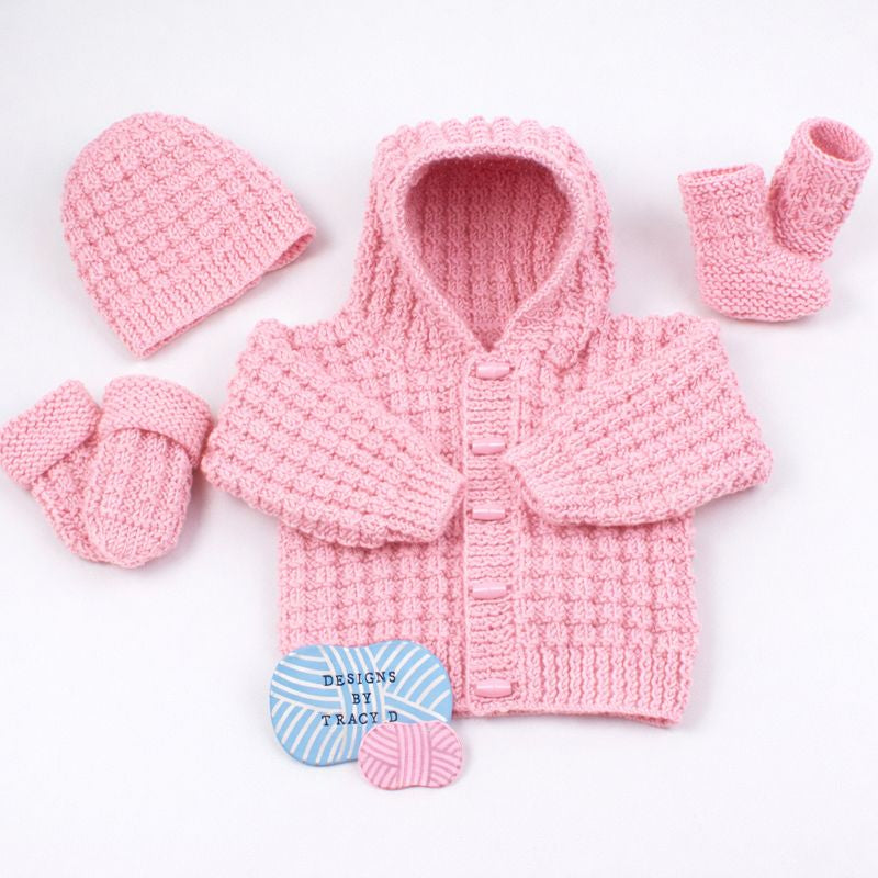 is a unisex Baby Knitting Pattern with a cardigan, 2 styles of hats, and booties to fit a baby with a 16/18" chest size when using DK yarn with 3.25mm and 4mm needles.