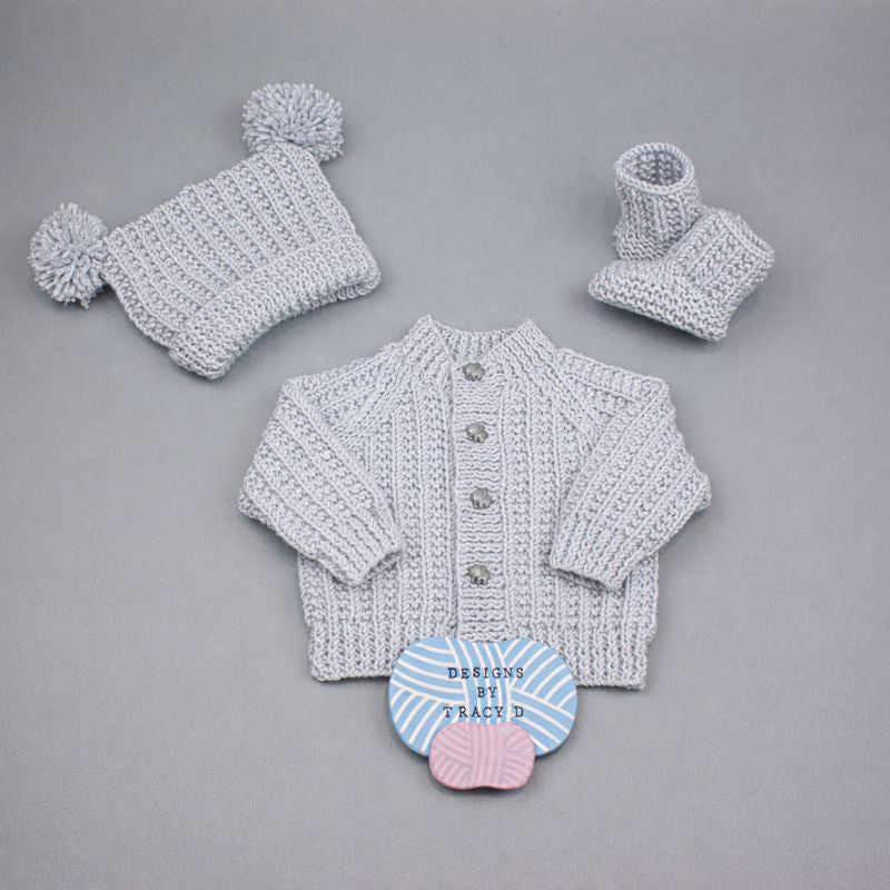 is a unisex Baby Knitting Pattern for a cardigan, hat, and booties, to fit a baby 16" chest using DK Yarn with 3.25mm & 4mm needles.